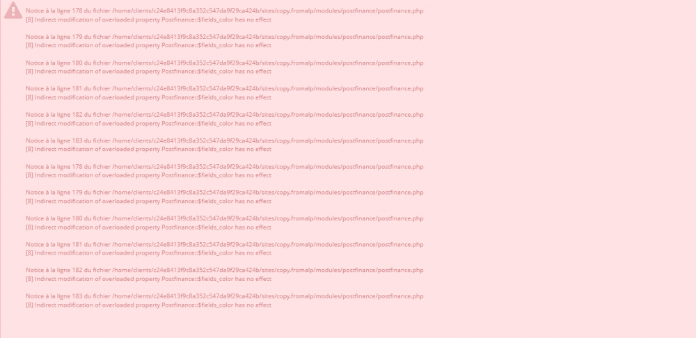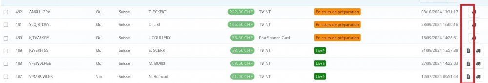 Lorsque vous allez dans la commande, onglet "Documents" avez-vous une facture ? Bizarrement, oui.... mais c'est aléatoire Si pas de facture, le bouton "créer une facture" fonctionne ? Oui mais l'icone ne s'affiche pas dans la colonne !! Concernant le module postfinance il faudrait ajouter la variable "public $fields_color;"dans la liste des variables définies au debut du fichier postfinance.php ----> Es que le bug des facture pourraient venir de la? -